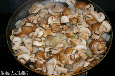 Next, chop half a yellow onion and add in an 8 oz container of mini bella mushrooms (or whatever you have on hand). I chose to use mushrooms as a healthy alternative to meat. These are very hearty mushrooms and they are like mini sponges that soak up all surrounding flavors.